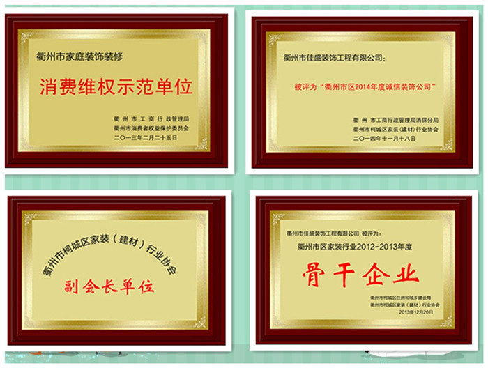 2011-2016年被衢州晚報評為十家最值得信賴的裝飾企業(yè);2016年被市場監(jiān)督管理局評為衢州市誠信裝飾企業(yè);